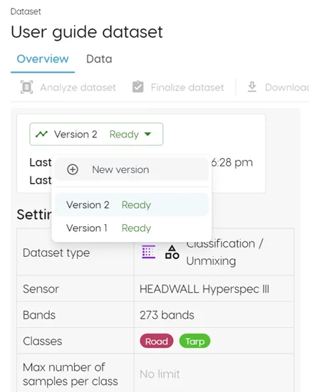 Click on the "Version" button, then "New version" to create a new iteration of either your dataset or associated model. You may want to do this if you decide to add additional selections or classes to your dataset, or train a model with different parameters. You can see each version as a toggleable layer in the Spectral Explorer page, making it easy to compare and contrast different versions of your dataset and model.