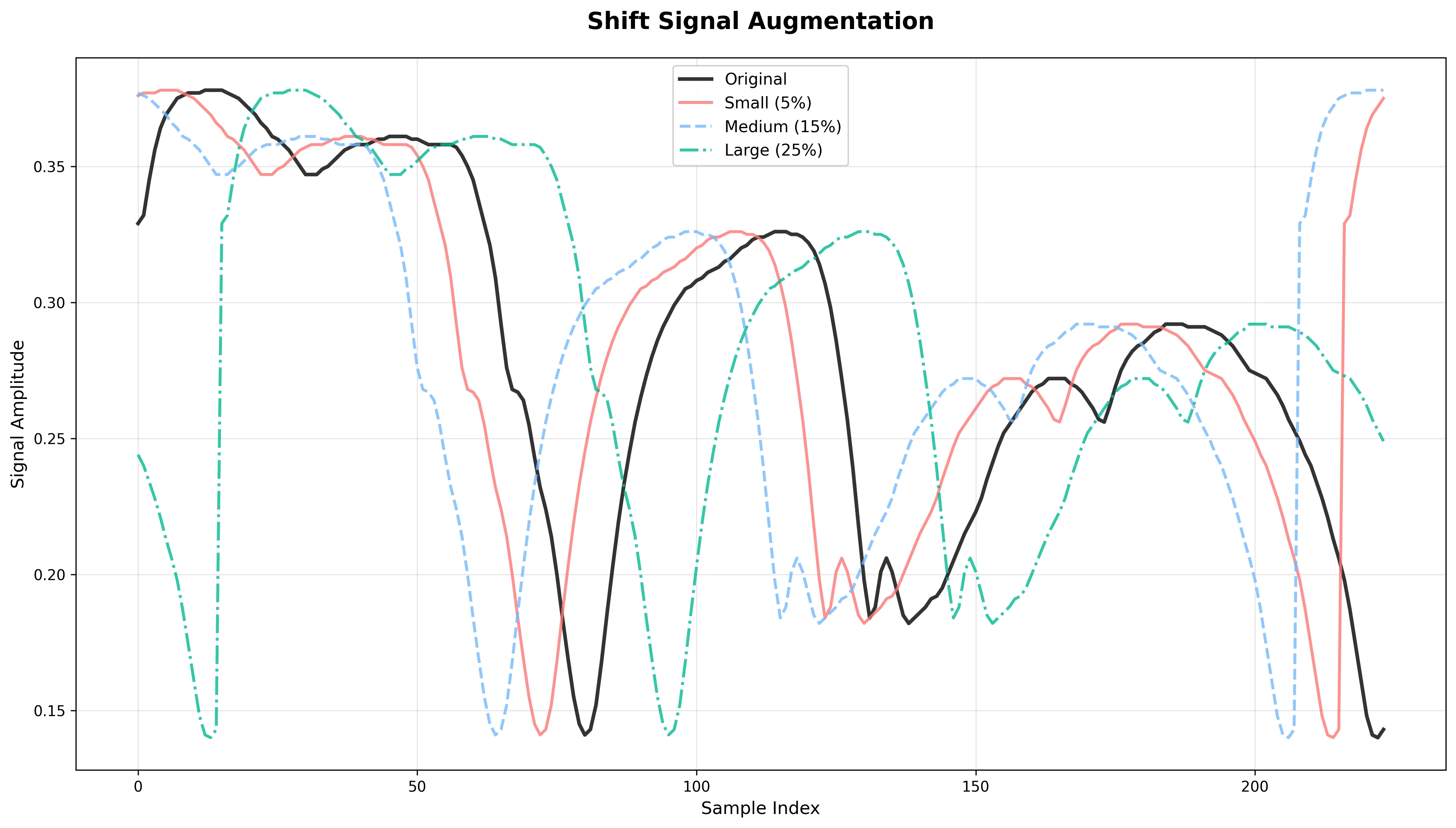 What it does: Randomly rolls the signal left or right by up to shift_max × signal length.