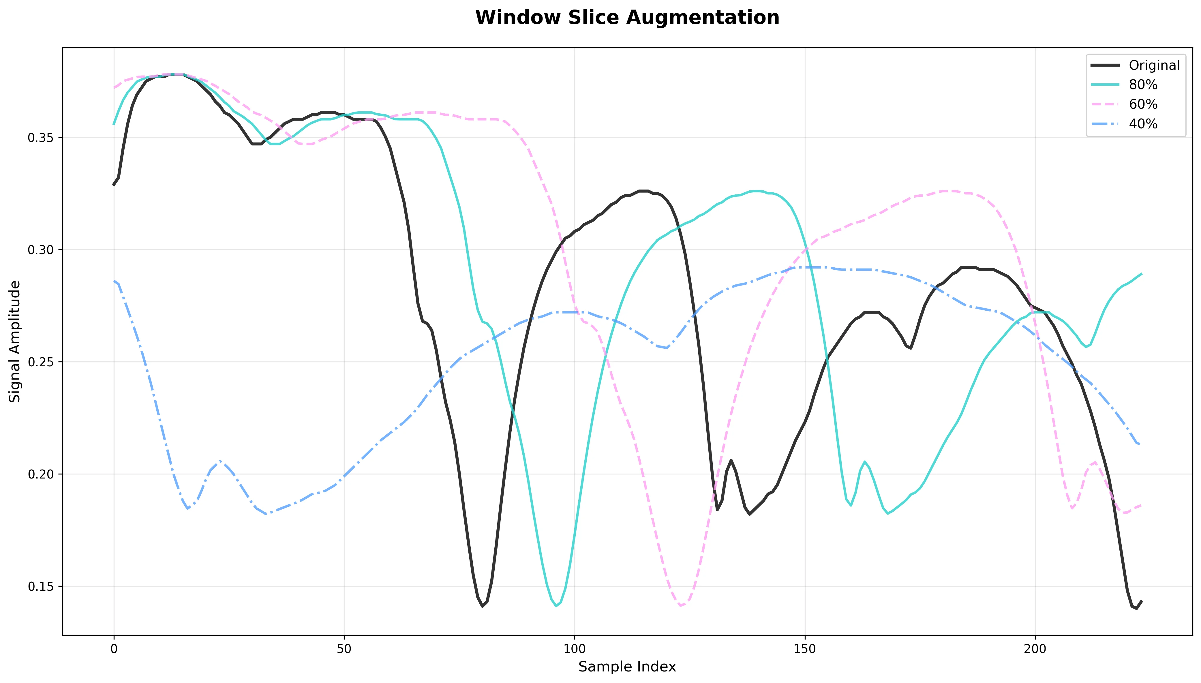 Risk: If discriminative features lie outside the retained window, the model may lose critical classification cues. Aggressive slicing is dangerous when classes differ only by subtle spectral features.