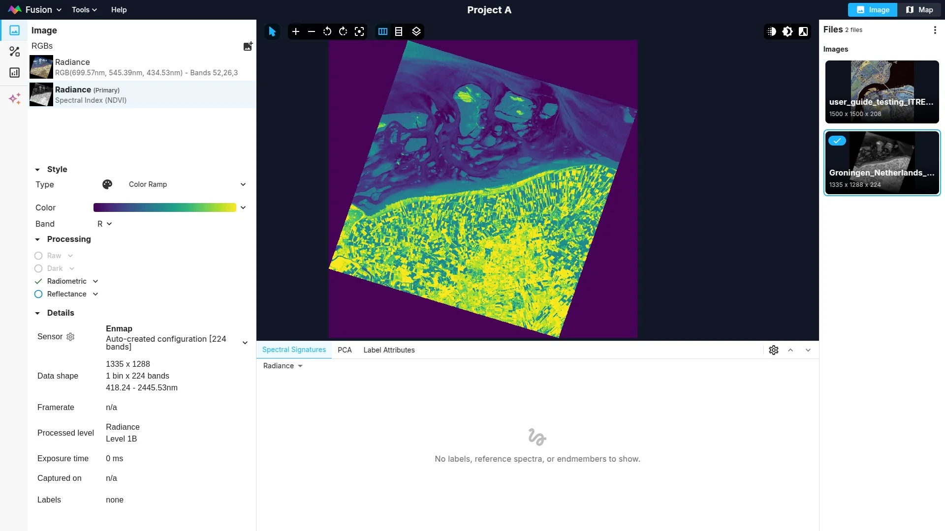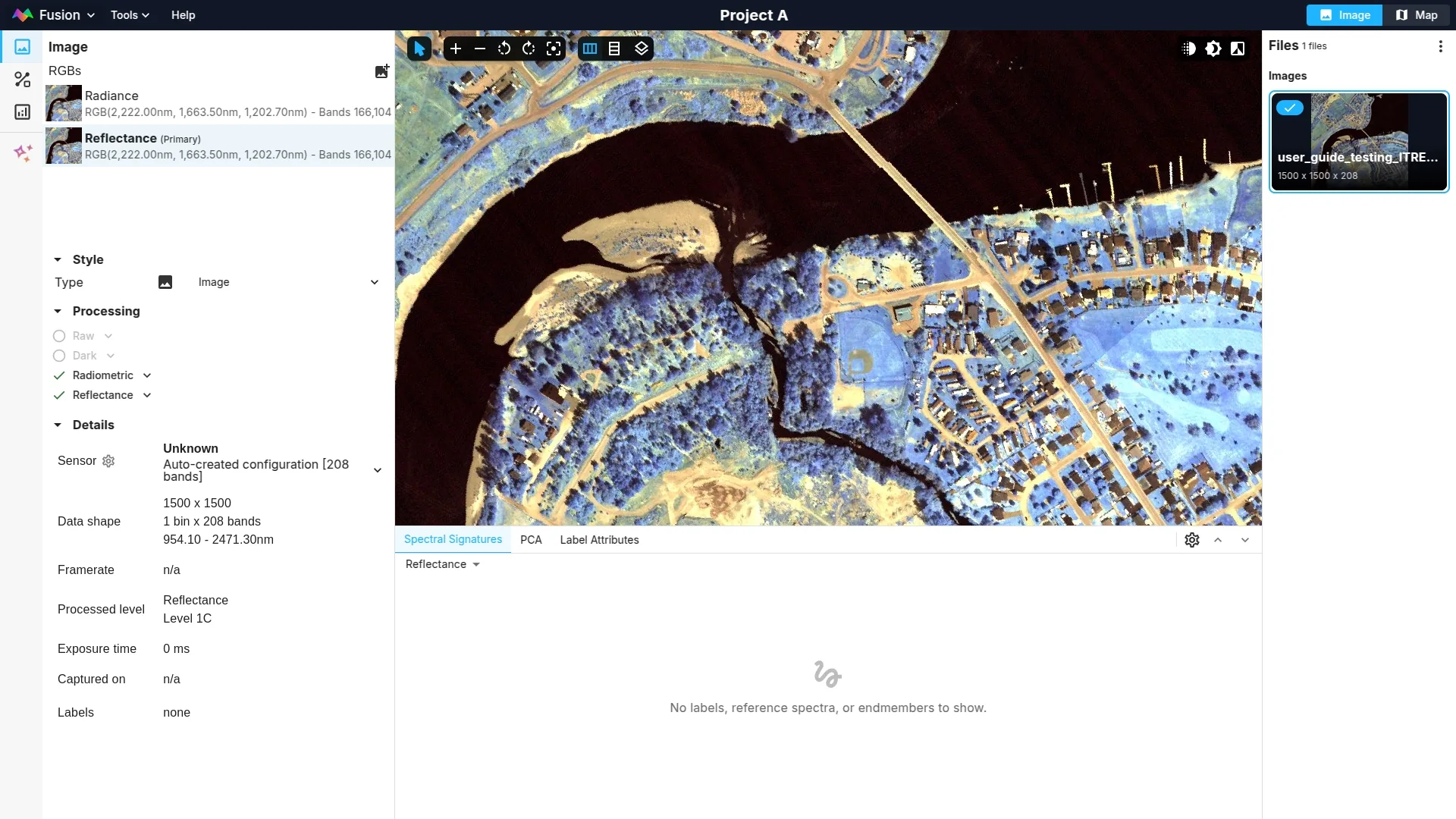 The image tab allows you to view your image metadata, change or generate new RGBs, edit the style (color map, opacity, etc.), and change preprocessing steps.